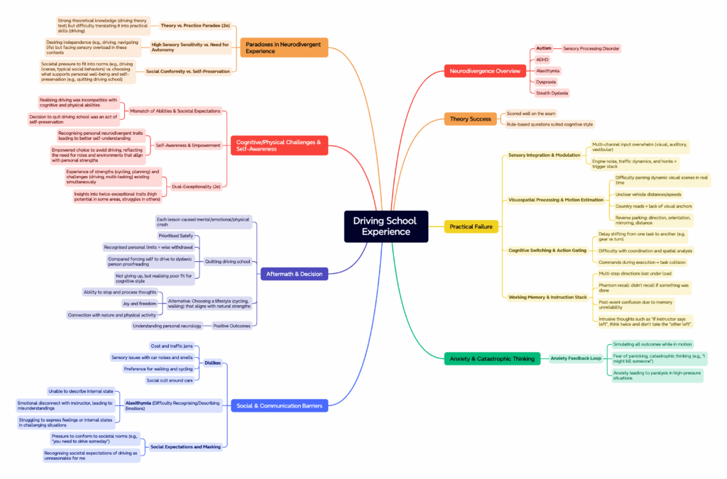 The challenges extended beyond just the mechanics of driving. There was a fundamental communication barrier between my instructor and me. I was totally unable to articulate how I was feeling or what I was experiencing. It wasn’t just about finding the right words—it was about first identifying and then translating my internal state into something comprehensible to both of us. This difficulty in recognising and describing emotions, sometimes called alexithymia, made an already challenging situation feel even more impossible to navigate. The frustration from this disconnect made the overload of feelings and thoughts even worse, leading to a situation full of misunderstandings and stress.