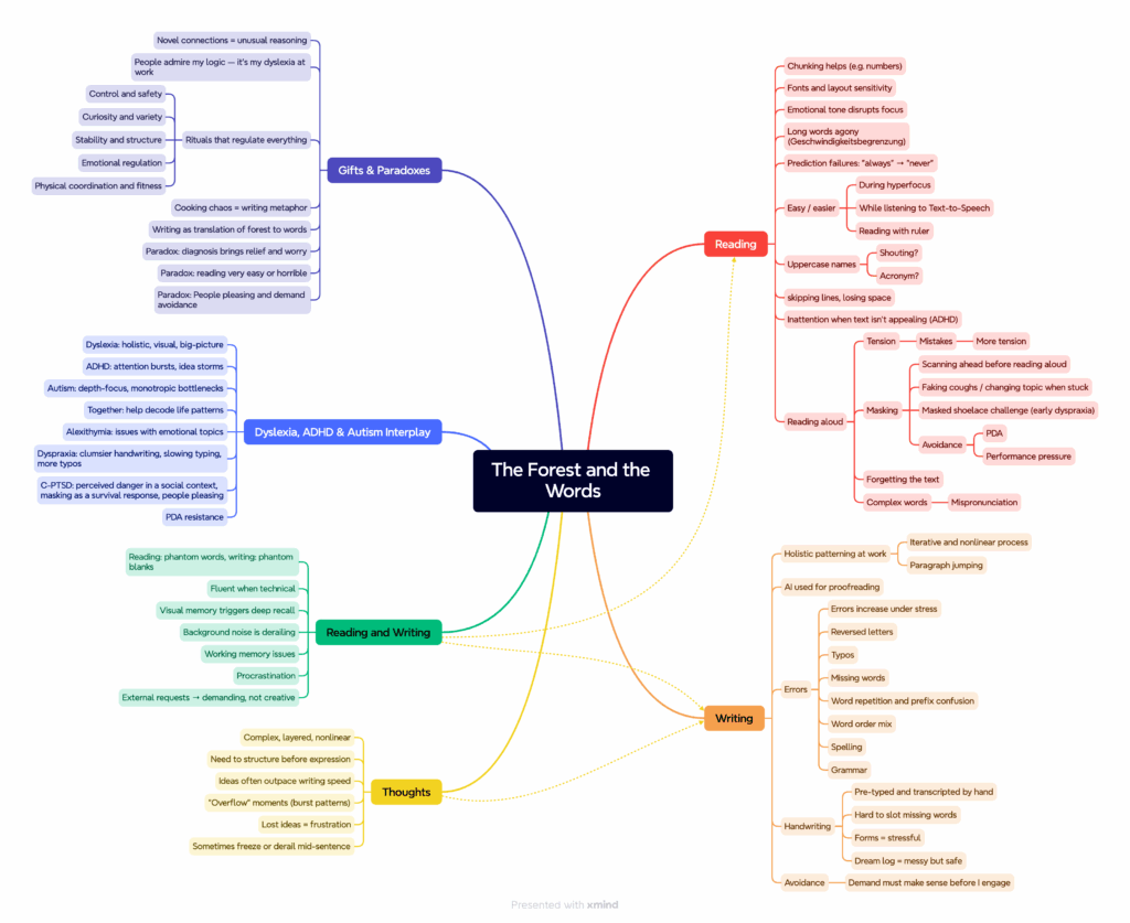 My reading and writing combine dyslexia-like traits (phantom words, skipped lines, sequencing challenges) with ADHD’s focus shifts — sometimes I hyperfocus and flow, sometimes I struggle at every step.